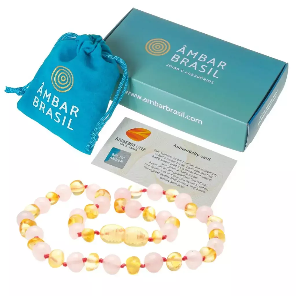Material: Âmbar Báltico (natural e legítimo) e quartzo rosa