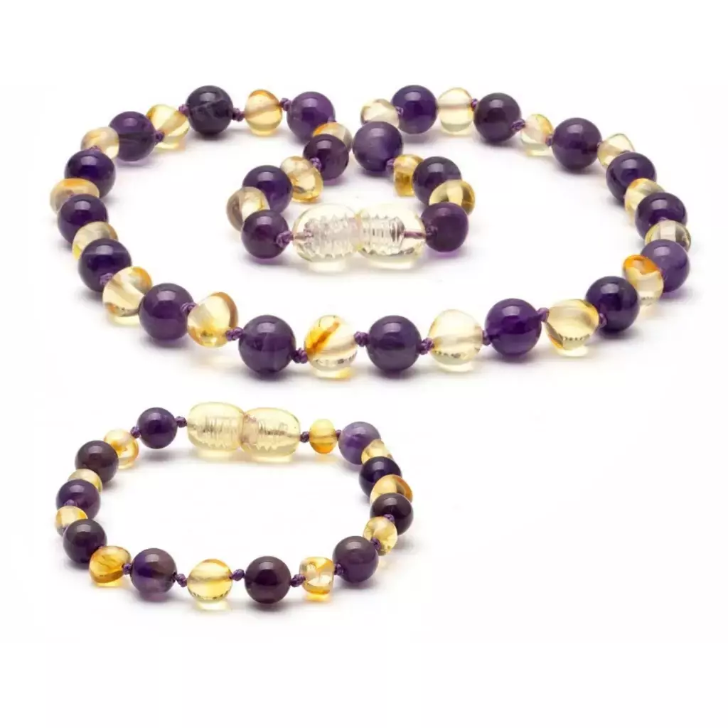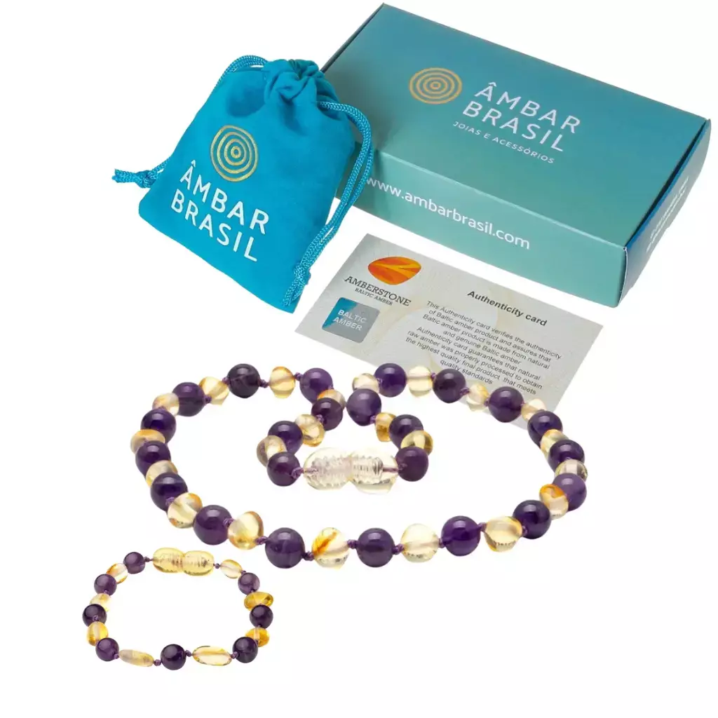 O colar tem 33 cm, que é o tamanho que a gente recomenda para uso desde recém-nascido até cerca de 1 aninho e a pulseira tem 14 cm, podendo ser usada no tornozelo durante os primeiros meses de vida e depois no pulsinho até cerca de 5 anos. Ambos tem contas amarradas uma a uma em cordão de poliéster e fecho rosca.